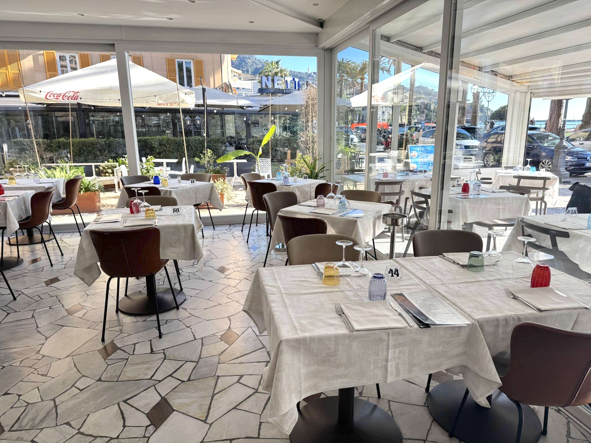 Un ristorante completamente avvolto dalle vetrate, affacciato sulla splendida passeggiata mare di Rapallo.